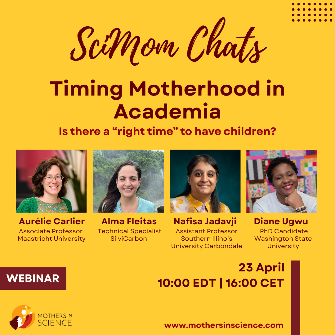 Join us for our next SciMomChats event to explore whether there is a “right time” to have children while navigating an academic career–drawing on both research and the lived experiences of academic mothers. Register now!